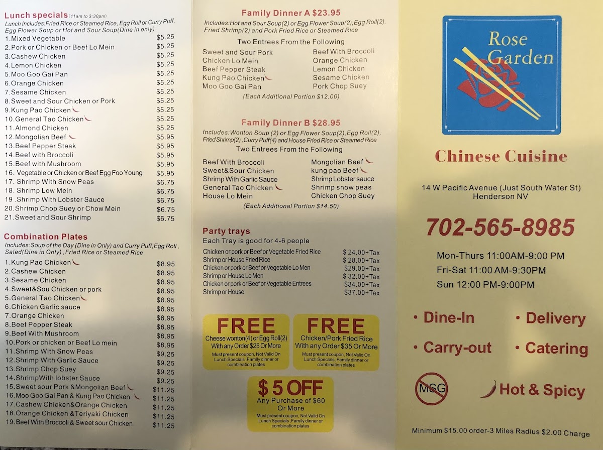 Welcome to Rose Garden Restaurant, a hidden gem located at 14 Pacific Ave, Henderson, NV. This inviting Chinese eatery is celebrated for its diverse menu and approachable prices, where you can indulge in delightful dishes like the Teriyaki Chicken Bowl or the flavorful Sweet & Sour Pork, each priced at just US$7.75 or US$10.00 for heartier selections.